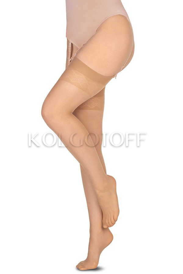Такие чулки не имеют самодержащейся резинки и удерживаются на ноге специальным поясом