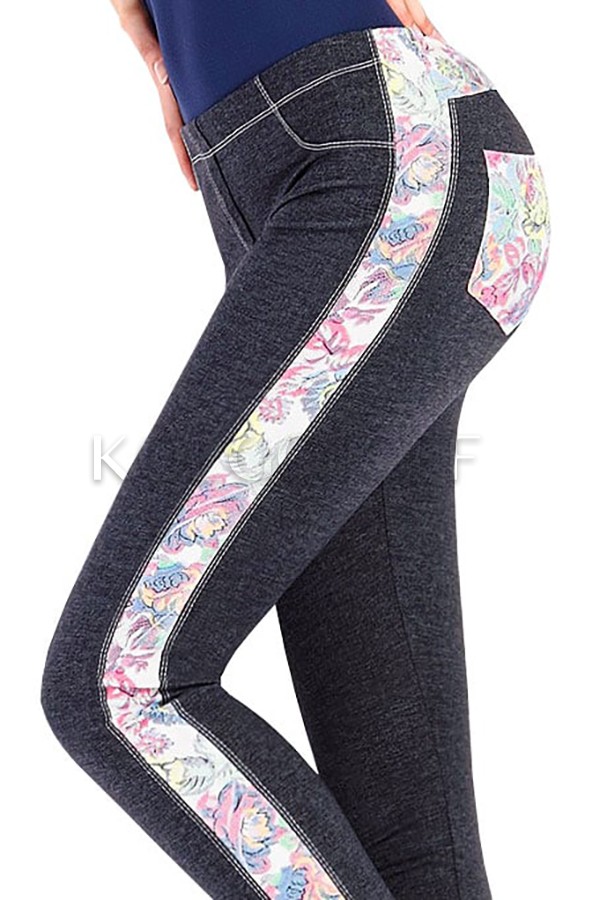 Оригинальные и модные укороченные женские леггинсы в джинсовом стиле с боковыми горизонтальными вставками. Сзади функциональные карманы в цвет боковых вставок, впереди имитация карманов. Кокетка и нижний манжет также выполнены вставками с цветочным принтом. Пояс на резинке, средняя посадка.