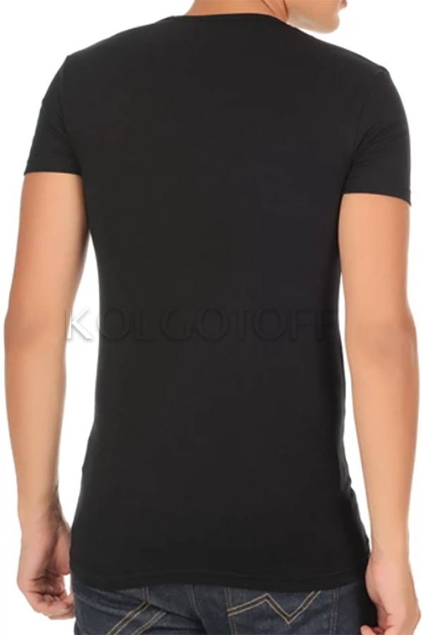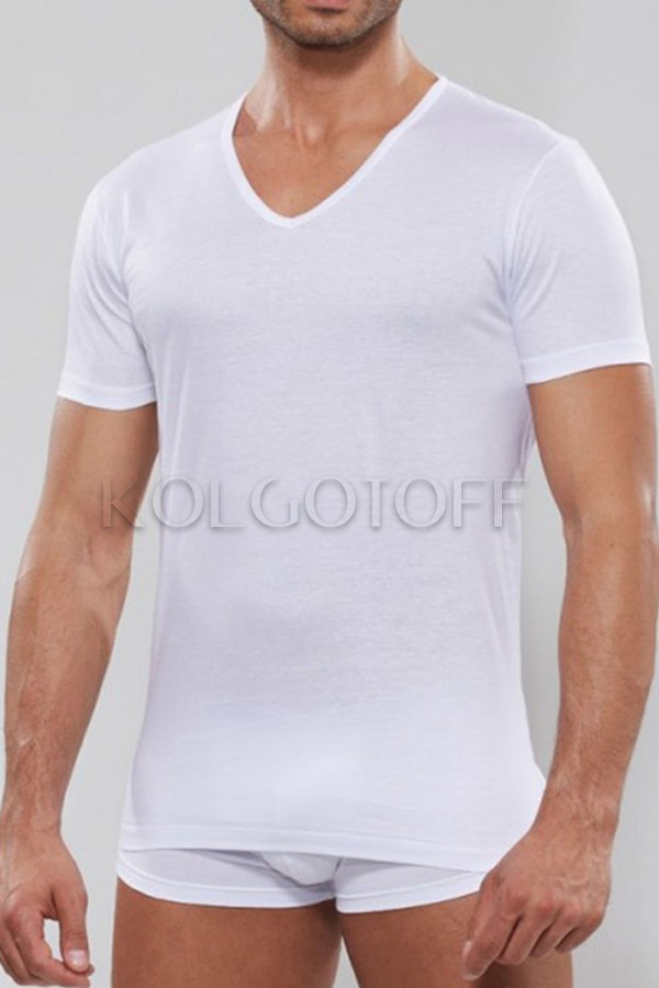 Однотонная мужская футболка классического кроя, с короткими рукавами и V-образным вырезом. Без боковых швов. 100% хлопок.