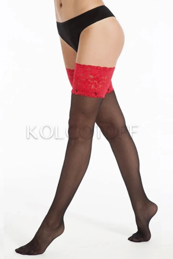 • DOLORES Rossana 20 - жіночі панчохи з мереживною гумкою червоного кольору на силіконовій основі шириною 15 см. Миски не виділені прозорі.