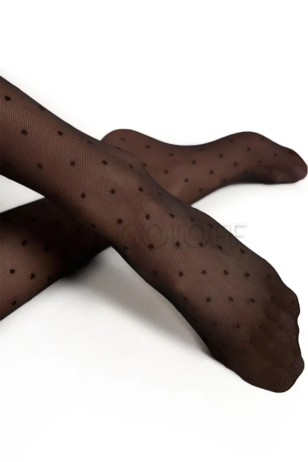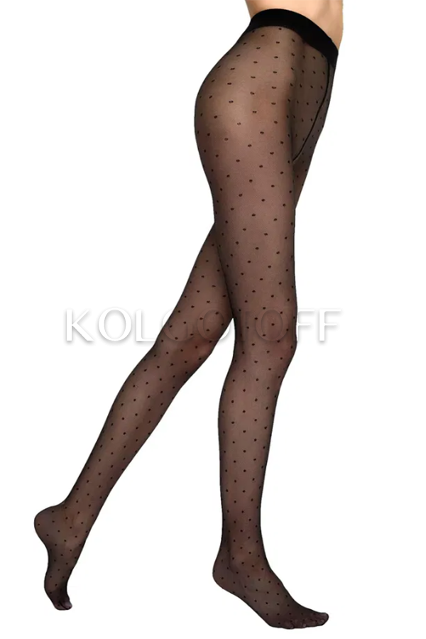 Тонкі жіночі колготки з імітацією дрібної сітки (ефект тюлі) декоровані точкою. Однорідні по всій довжині, елегантно та вишукано підкреслюють стрункість ніг. З широким комфортним поясом, плоскими швами, бавовняною ластівкою та невидимими мисками.