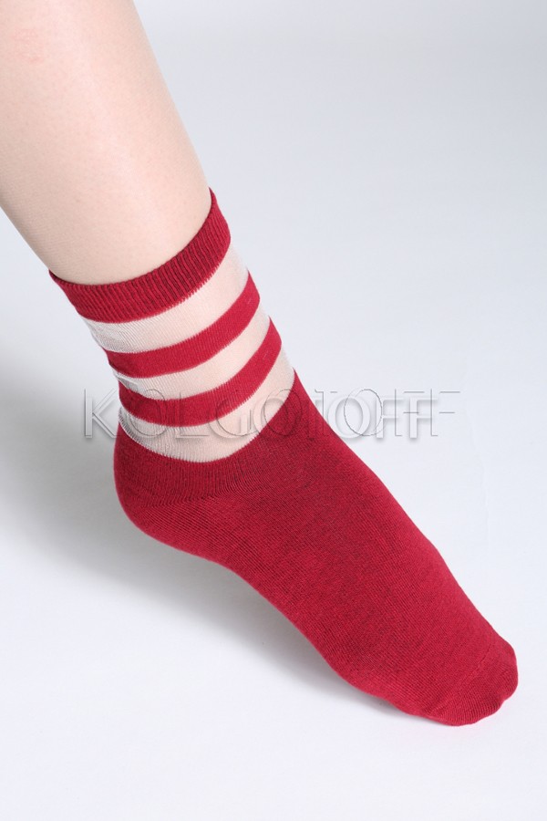 Жіночі оригінальні бавовняні шкарпетки зі вставкою з прозорою синтетичною мононити в області щиколотки. Вставка прикрашена візерунком широкі смуги в колір шкарпетки. Комфортна гумка. Розмір 36-38, 39-40. Одна пара в упаковці.