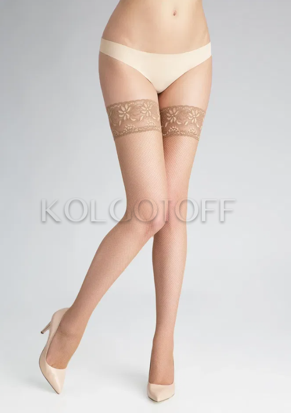 Елегантні жіночі панчохи в дрібну сітку з мереживною гумкою на силіконовій основі шириною 10 см. Невидимі миски.